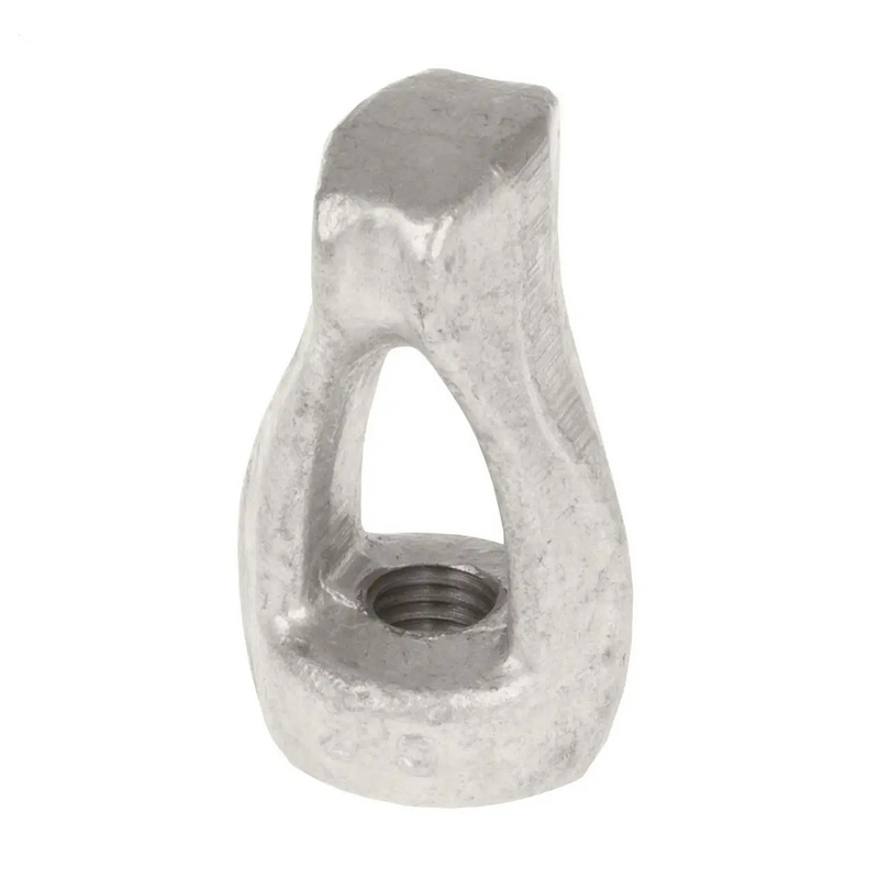 La tuerca de ojo del dedal se ensambla con el extremo roscado de un perno de ojo de 1/2 o 5/8 de pulgada, que atraviesa el poste de madera para soportar los aisladores de tensión hasta el cable sin salida; la tuerca de ojo doble se usa con tirantes dobles.El proceso principal en la fabricación de tuercas para ojos es la forja.El material es varilla de acero.